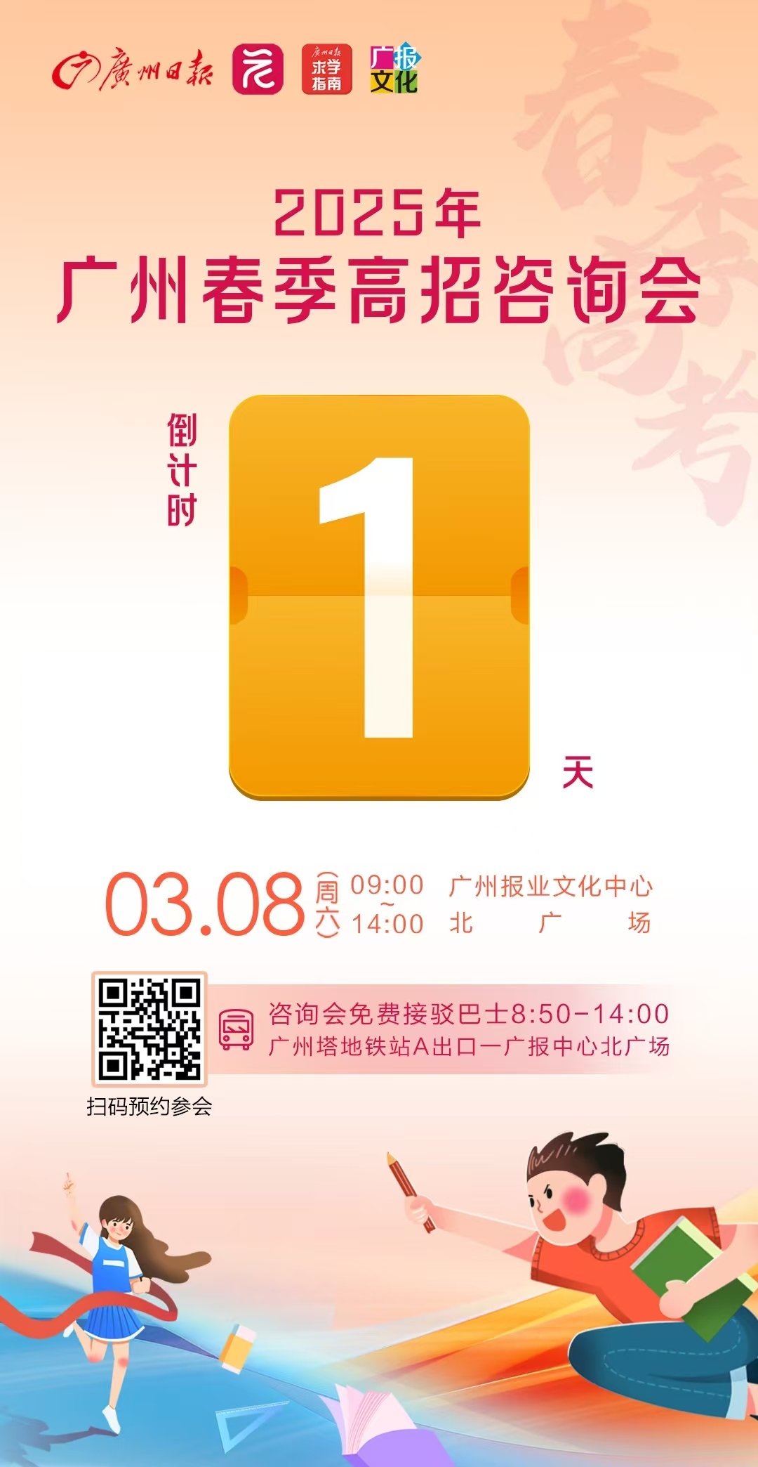 为助力考生精准填报院校志愿,获得和心仪院校一对一线下咨询的机会,2025年广州市普通高等学校春季考试招生现场咨询会(以下简称2025年广州春季高招咨询会)定于3月8日9:00—14:00在广州报业文化中心北广场举行。