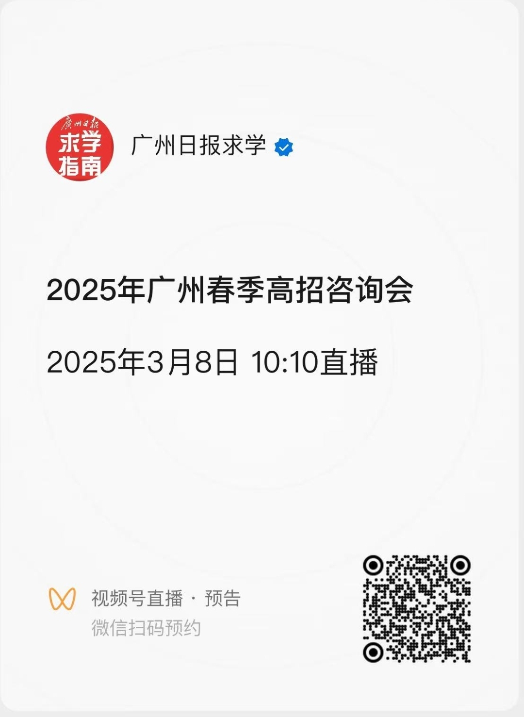 创新招考服务,主办方特别搭建宣讲舞台,邀请来自广州市招考办、广东技术师范大学的专家解读春季高考升学政策、广东高等职业教育发展现状,用真实数据和以往填报案例为考生指点迷津。广州番禺职业技术学院、深圳信息职业技术学院、香港职业训练局等单位的招生代表将轮番登台专场宣讲,方便考生深入了解心仪院校。广州日报官方新媒体平台将对宣讲环节进行实时直播,为未能到场的考生提供便利。可以扫码预约观看直播,了解分享内容。