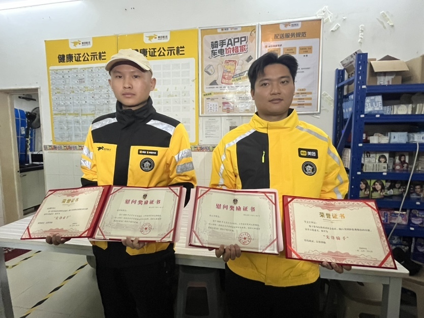 “今天能获得奖励,我们都觉得很意外,举手之劳罢了,做了一件小事,没想到会受到这么多人关注。”为及时奖励两位平民英雄的义举,7日上午,广州市见义勇为基金会理事长、秘书长等人专门来到两名外卖小哥工作的美团琶洲配送部站点,为他们送去慰问奖励证书以及慰问金等。同时,美团也为两人颁发“先锋骑手”奖励。