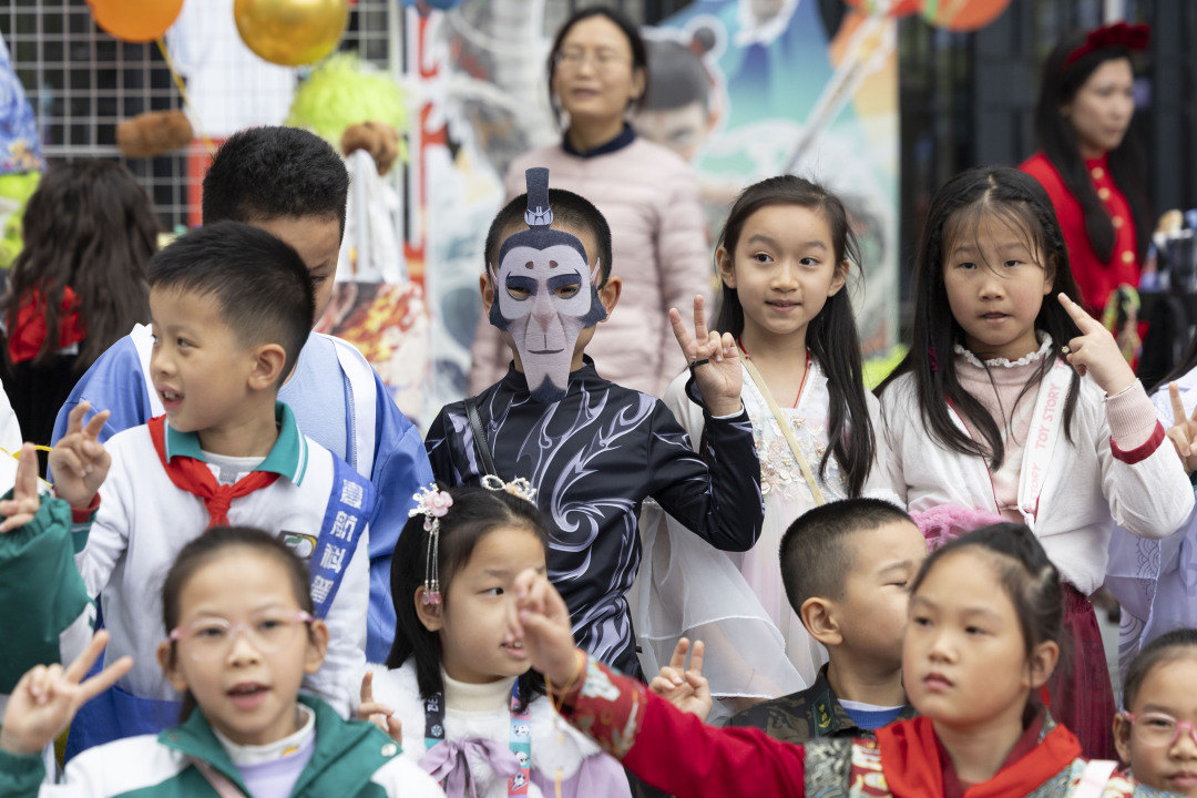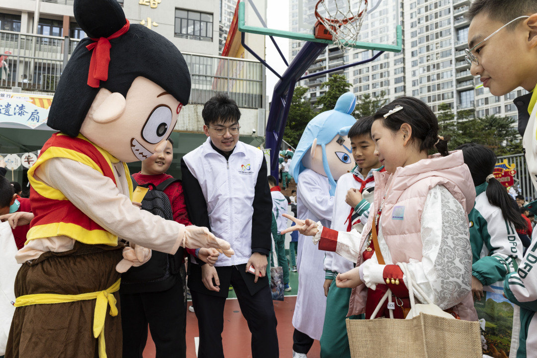 活动现场,学生们化身中国经典动漫角色、影视人物、戏曲名角,将操场打造成传统文化的海洋。“大圣归来·花果山集市”“哪吒闹海·龙宫探秘”“流浪地球发动机”“觉醒年代新青年社”“京剧脸谱研究所”“皮影戏光影剧场”“青花瓷研究所”等每个摊位各出奇招,集知识性、趣味性、互动性于一体,让传统文化在体验中焕发新生。