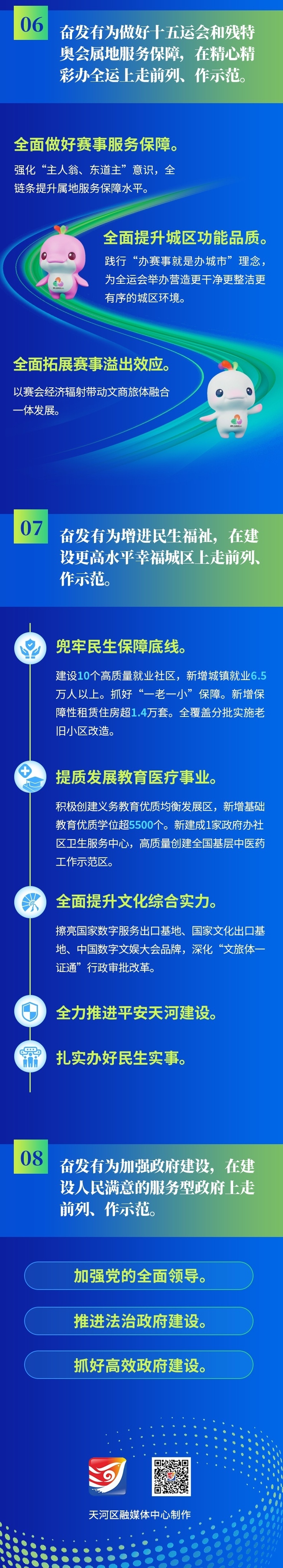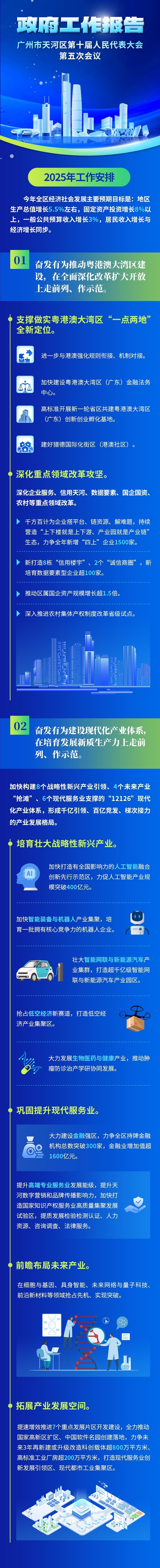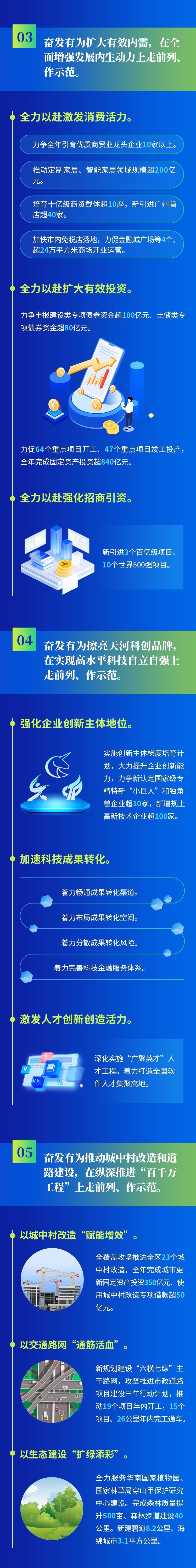 报告强调,今年全区经济社会发展主要预期目标是:地区生产总值增长5.5%左右,固定资产投资增长8%以上,一般公共预算收入增长3%,居民收入增长与经济增长同步。为实现上述目标,天河区重点要做好以下工作。一图读懂2025年天河将要怎么做?