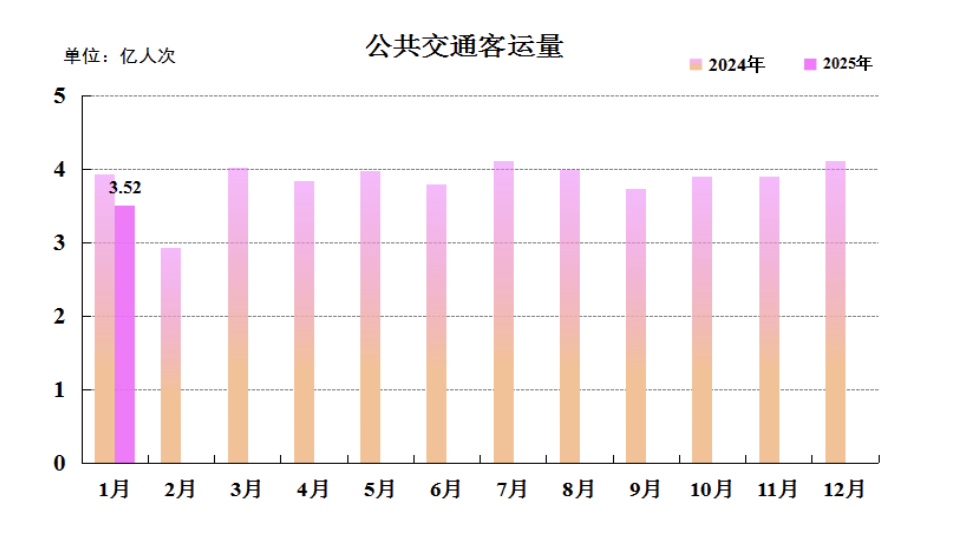 公共交通方面,1月全市公共交通客运量为3.52亿人次,日均客运量为1135万人次。其中,城市轨道交通日均客运量为827万人次,常规公交日均客运量为245万人次,巡游出租车日均客运量为61万人次,水上巴士日均客运量为2万人次。从公共交通客运占比来看,本月城市轨道交通客运量占72.85%,常规公交占21.58%,巡游出租车占5.37%,水上巴士占0.20%。