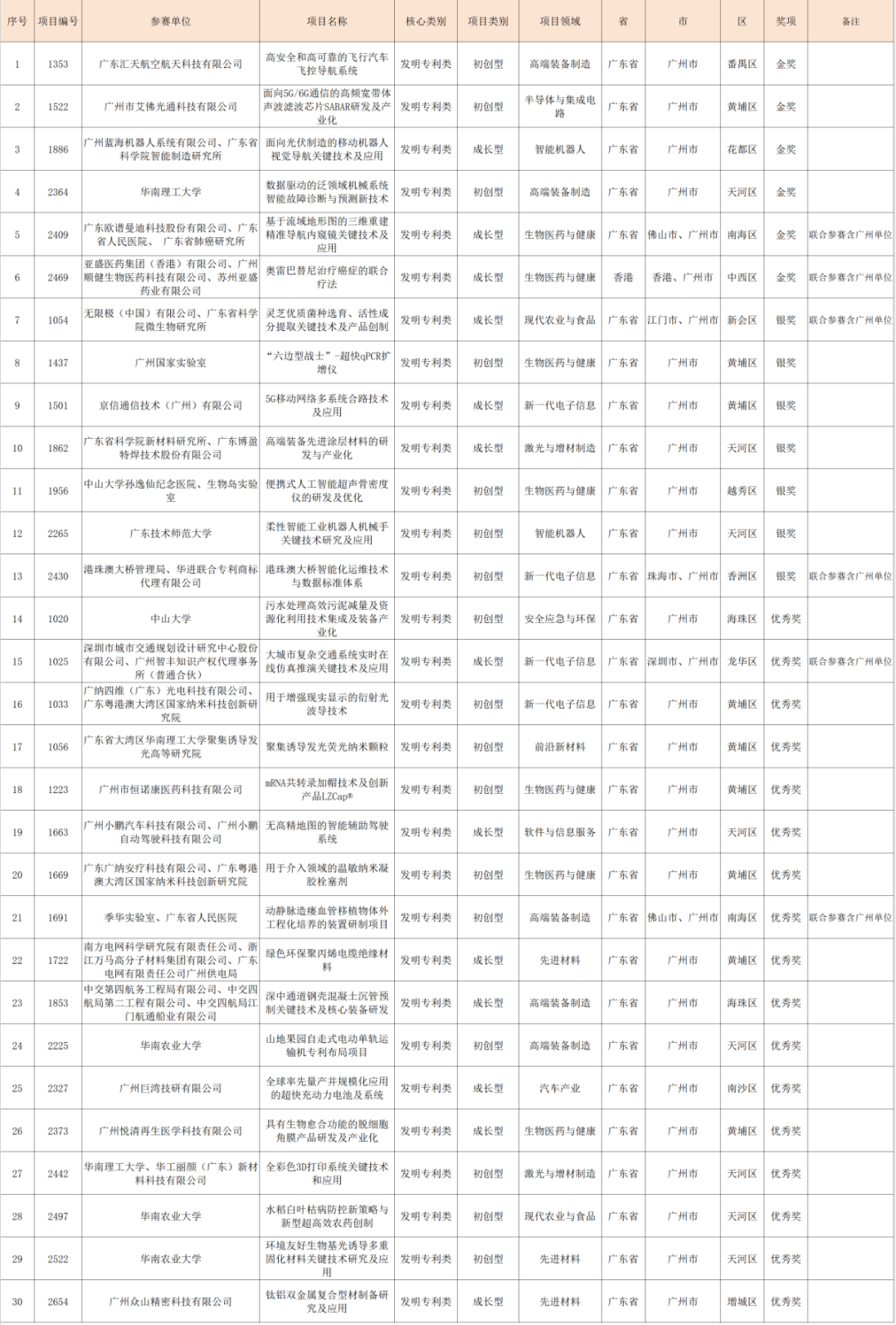 从获奖项目的领域分布看,广州市获奖位列前三的项目领域分别为:生物医药与健康、高端装备制造、新一代电子信息。