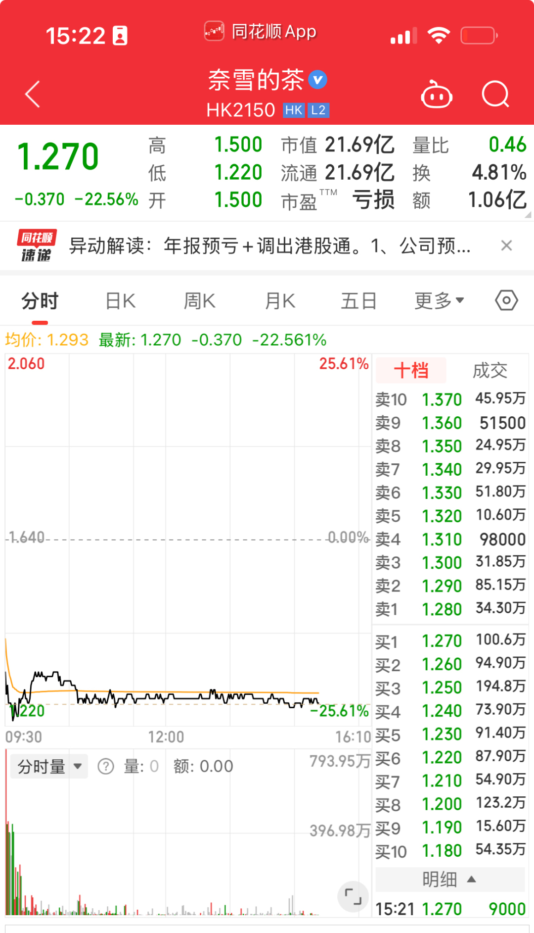 市场分析,奈雪的茶大跌受年报预亏以及被调出港股通影响。消息面上,3月10日,深沪港通下港股通标的调整结果生效,调整原因是此前恒生综合大型股指数、中型股指数、小型股指数实施的成分股调,调入27股,调出则包括奈雪的茶、百果园集团等28只股。这一变动对奈雪的茶的股价产生了不小冲击。