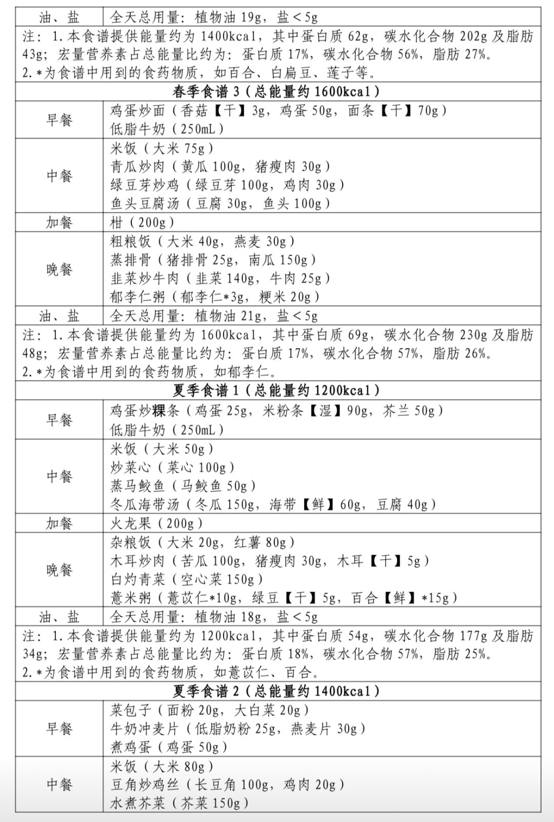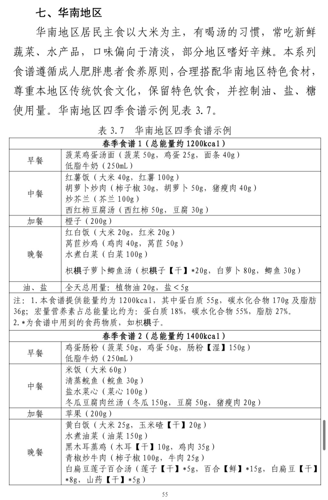 指南详细列出了食养原则、每天具体吃多少、优先选的食物、应少吃的食物,还特别给出了全国不同地区的食谱示例,并备注了食谱的“总能量”。
