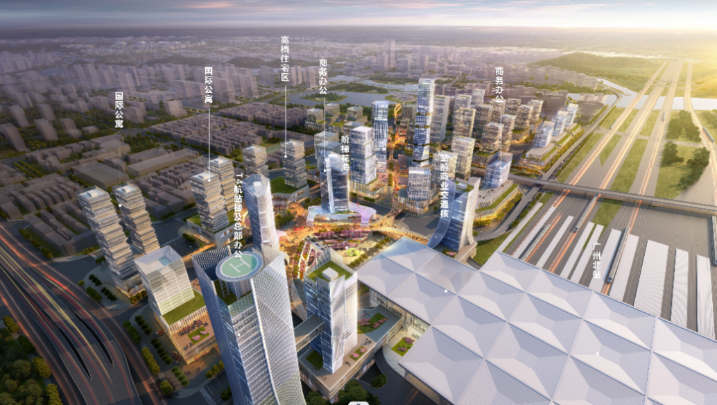 北站商务区效果图瞄准人流量较大的公共中心地标,花都将以广州北站商务区、花都中央商务区等为重点,塑造具有花都特色的现代城市中心区景观。广州北站商务区形成以广州北站为核心的开放城市空间,打通跨铁路的东西向城市通道,打造场站综合体地标形象。山水田园,岭南风韵。花都将综合利用空港北部地区田园、丘陵、水网等自然地貌,通过连通零散的生态和农业斑块,重塑完整自然生境,沿山前旅游大道、九湾潭水库西干渠、流溪河干渠等走廊塑造以花田、稻田、果林、水乡等为主题的连续田园景观,尽显岭南文化韵味。同时,花都将结合流溪河、洛场碉楼群、港头古村等山水自然禀赋、镇村历史特色形态,重点保护原有山水空间和镇村街巷格局,突出岭南圩镇、美丽乡村特色风貌。