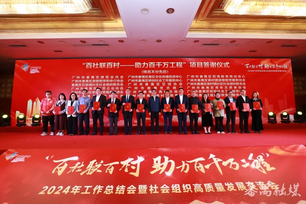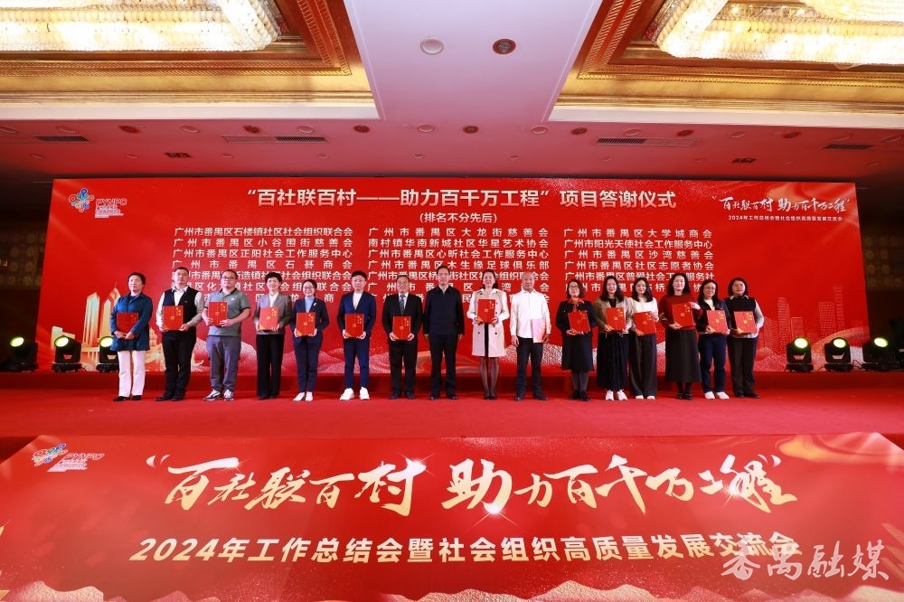 3月10日,番禺区社联会举行2024年“百社联百村——助力百千万工程”工作成果总结会暨社会组织高质量发展交流会,共同聚焦社会组织高质量发展,全力推进助力“百千万工程”。广州市民政局党组成员、副局长、市社会组织管理局局长李锐,番禺区委书记黄彪,区委副书记、区长叶珊瑚,区人大常委会党组书记、主任覃海深,区政协党组书记、主席邓耀棋,区委副书记饶洁怡,区委常委、组织部部长唐力明,区人大常委会副主任王向东,副区长陈建任、郭洪杰,区政协副主席冯润胜、周建中、金丹华、张启泉等区领导;市民政局、区有关职能部门、16个镇街有关负责人,社会组织领域专家代表等出席会议。