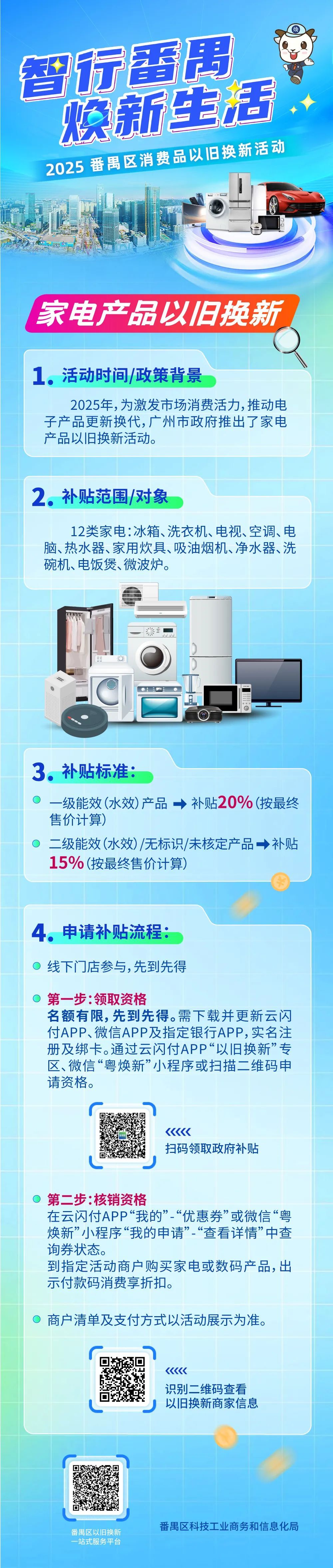 近日,广州2025年以旧换新细则公布。本次活动覆盖冰箱、洗衣机、电视等12类家电产品,补贴标准根据能效等级不同,分别给予15%至20%的补贴。消费者可通过指定平台申请补贴资格,并在活动商户享受折扣优惠。此次家电以旧换新活动,旨在促进家电消费,助力绿色经济发展。