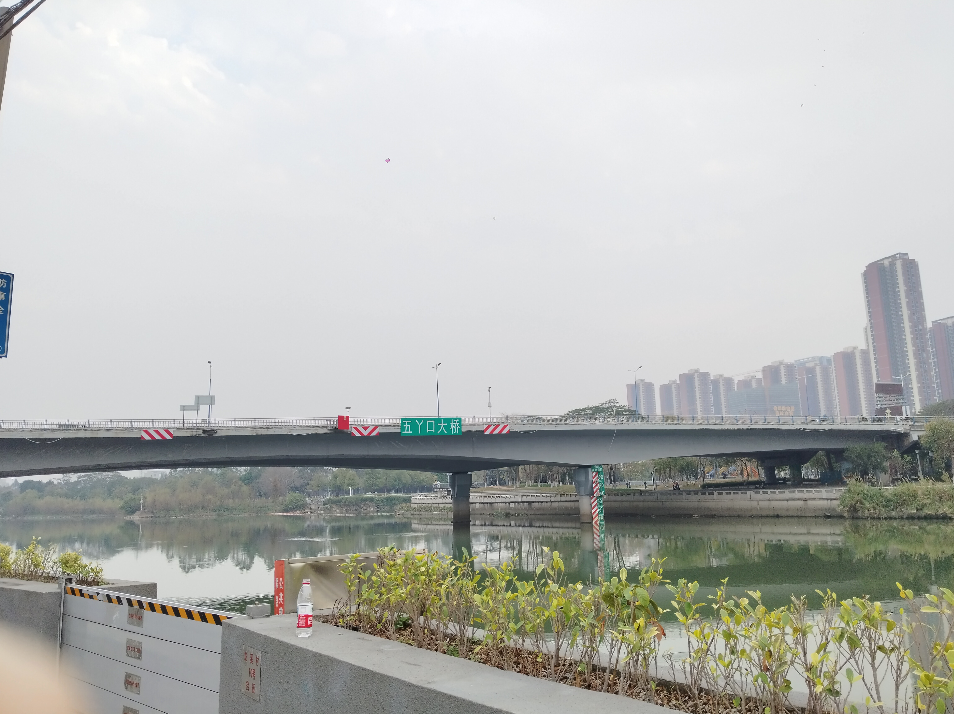 作为广佛交界重要沟通桥梁之一,五丫口大桥位于佛山市南海区与广州市荔湾区交界处,该桥西起于海八东路,跨越佛山水道,东终于龙溪大道。五丫口大桥桥长176.7米,为三跨预应力混凝土变截面连续箱梁桥,中跨78米,边跨分别为56米和42.7米。