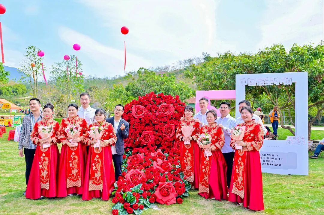 在玫瑰谷深处,“浪漫春日·玫瑰有约”踏青赏花半日游暨美丽庭院健步走活动也在同步开展,吸引了60多支队伍共200多人参加。还有一场浪漫的集体婚礼正在上演,6对新人身着华服,在漫天花雨中许下了永恒的誓言。