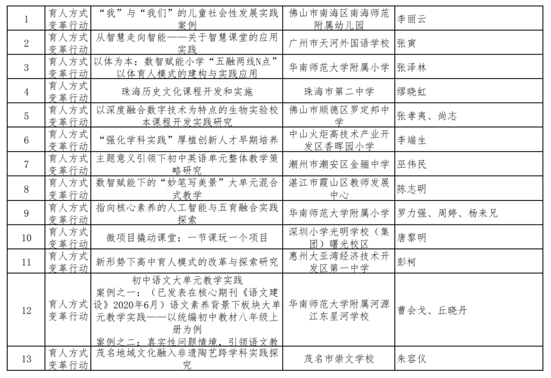 记者梳理发现,来自广州学校的案例入选了10个。其中,课程方案落地行动类别有广州市越秀区东方红幼儿园《幼儿园广府文化特色课程研究》,广州市南武中学《拓潜教育:“古风新韵”课后服务课程建设点亮素养提升之路》,广州市越秀区小北路小学《“我与小红棉”大思政课程构建与实践》,广州市第九十七中学《数学建模×微信小程序——基于数智技术的高中数学特色课程》。育人方式变革行动类别有广州市天河外国语学校《从智慧走向智能——关于智慧课堂的应用实践》,华南师范大学附属小学《以体为本:数智赋能小学“五融两线N点”以体育人模式的建构与实践应用》《指向核心素养的人工智能与五育融合实践探索》,广州市越秀区启智学校《数字化转型驱动特殊教育革新——以越秀区启智学校为例》。关键素质提质行动类别有广东实验中学《广东实验中学综合实践活动学科基于深度教学的“四融二化”校本教研案例》,广州市花都区新雅街新雅小学《AI+PBL教学新样态的建构与应用实践案例》。