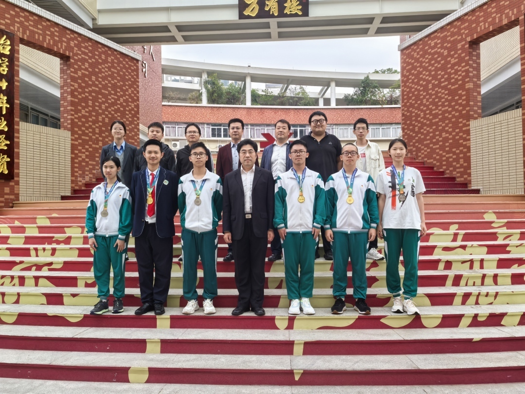 广东实验中学竞赛学子和教练团队与校长蔡骘(前左四)合影,杜宪同学(前右二)。
