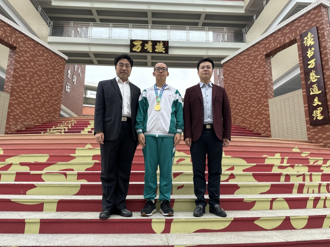 (从左往右)广东实验中学校长蔡骘、杜宪同学、广东实验中学副校长朱伯东