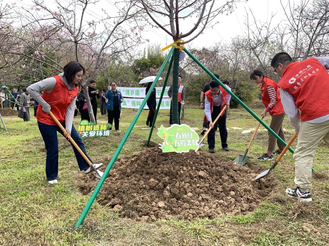 活动现场,参加人员分工合作,清杂挖穴、挥锹铲土、扶苗填坑、提水浇灌,认真完成每一道工序,最终种植广州樱等数十株树苗,一片片新绿在春风中焕发出蓬勃生机。新树苗成长后,会绽放花朵,将樱花林开花版图进一步扩大。