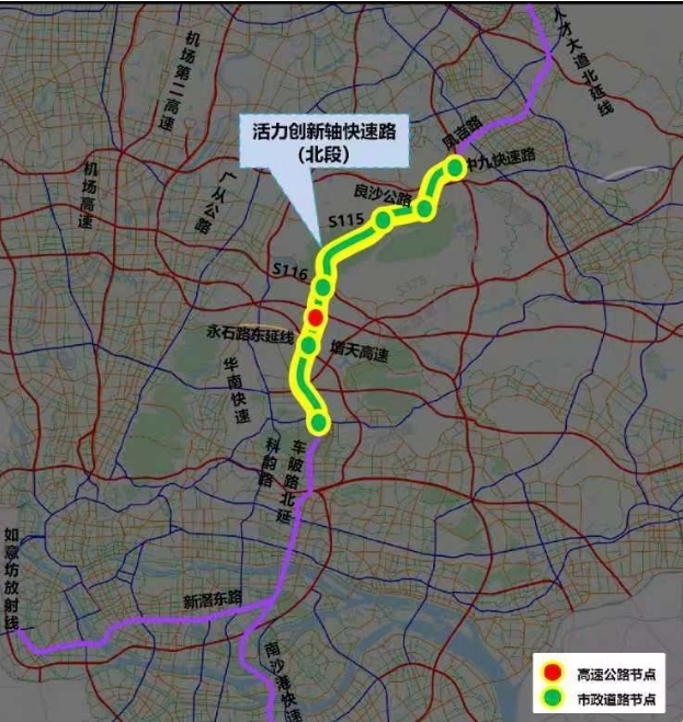 广州市活力创新轴快速路(北段)项目位于天河区、白云区和黄埔区,南起车陂路北延线与广汕路交叉口,北至中九快速路与凤吉路交叉口,路线总长约21千米。本项目将在中新广州知识城与广州市中心区之间增加一条快速直达的免费通道,车行时间控制在15分钟左右,从北到南串联黄埔区凤吉路、中九快速路,白云区良沙公路、S115、S116、增天高速,天河区永石路东延线、广汕公路、车陂路北延线。