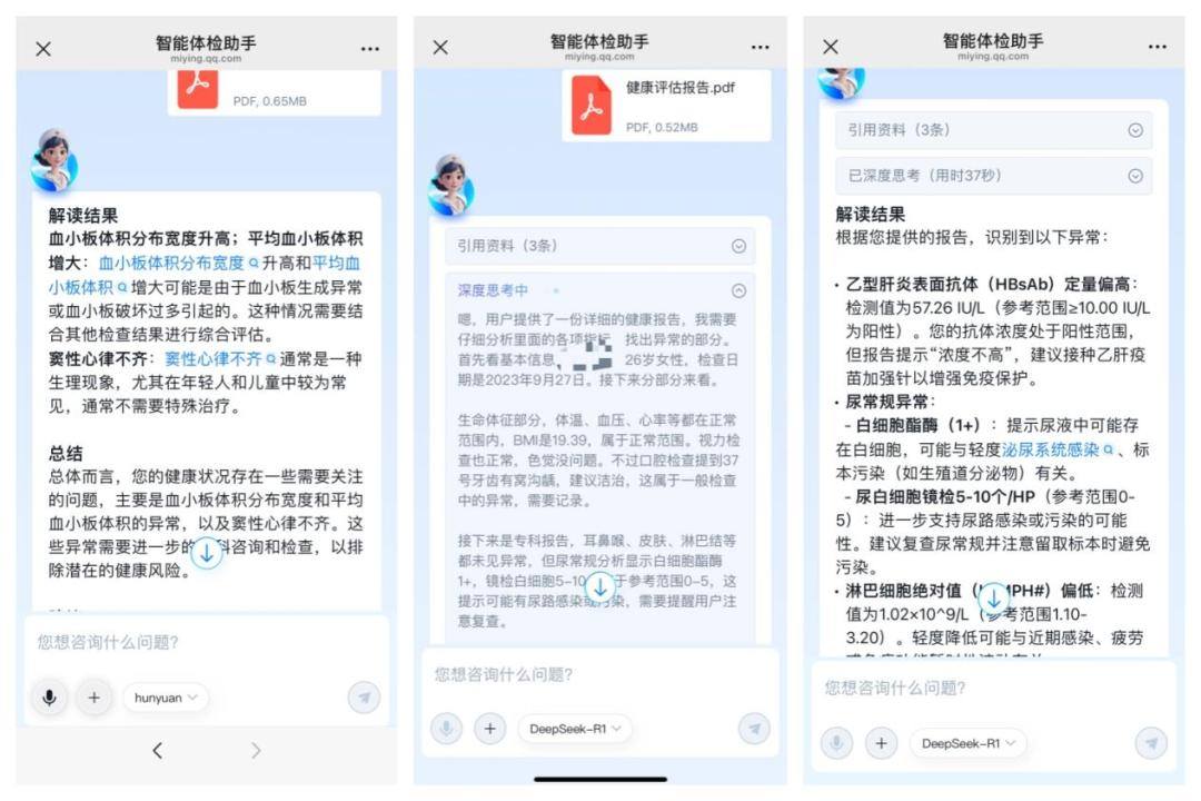用户可以根据需要自由选择在DeepSeek和腾讯混元之间切换,获取最合适的健康建议。两大模型的互补优势使得用户能够在体检和健康管理过程中,得到更为全面、科学的指导。