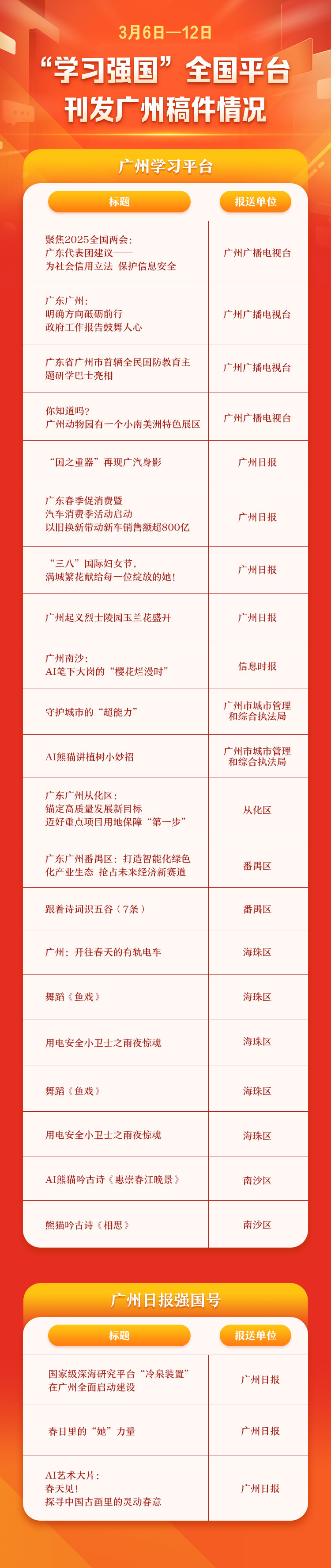 3月6日—3月12日“学习强国”全国平台刊发广州稿件情况