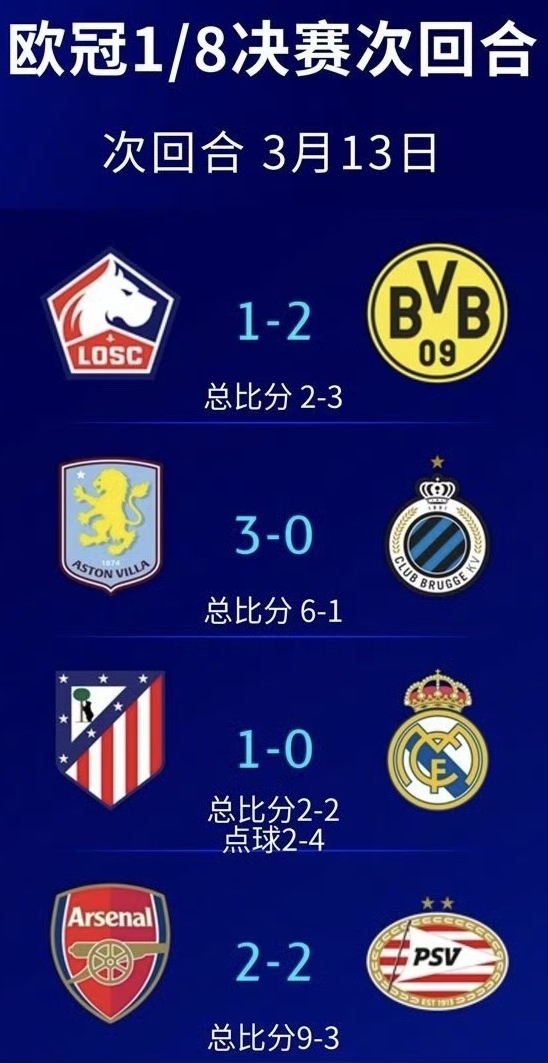 至此,本赛季欧冠8强全部出炉,8支球队全部来自欧洲5大联赛,英超、西甲、德甲各有两队,分别是阿森纳、维拉、皇马、巴萨、拜仁、多特蒙德,剩下两队分别是意甲的国米和法甲的巴黎圣日耳曼。本赛季的欧冠8强有6队跟上赛季的8强队伍一致,英超卫冕冠军曼城的缺席令人遗憾。