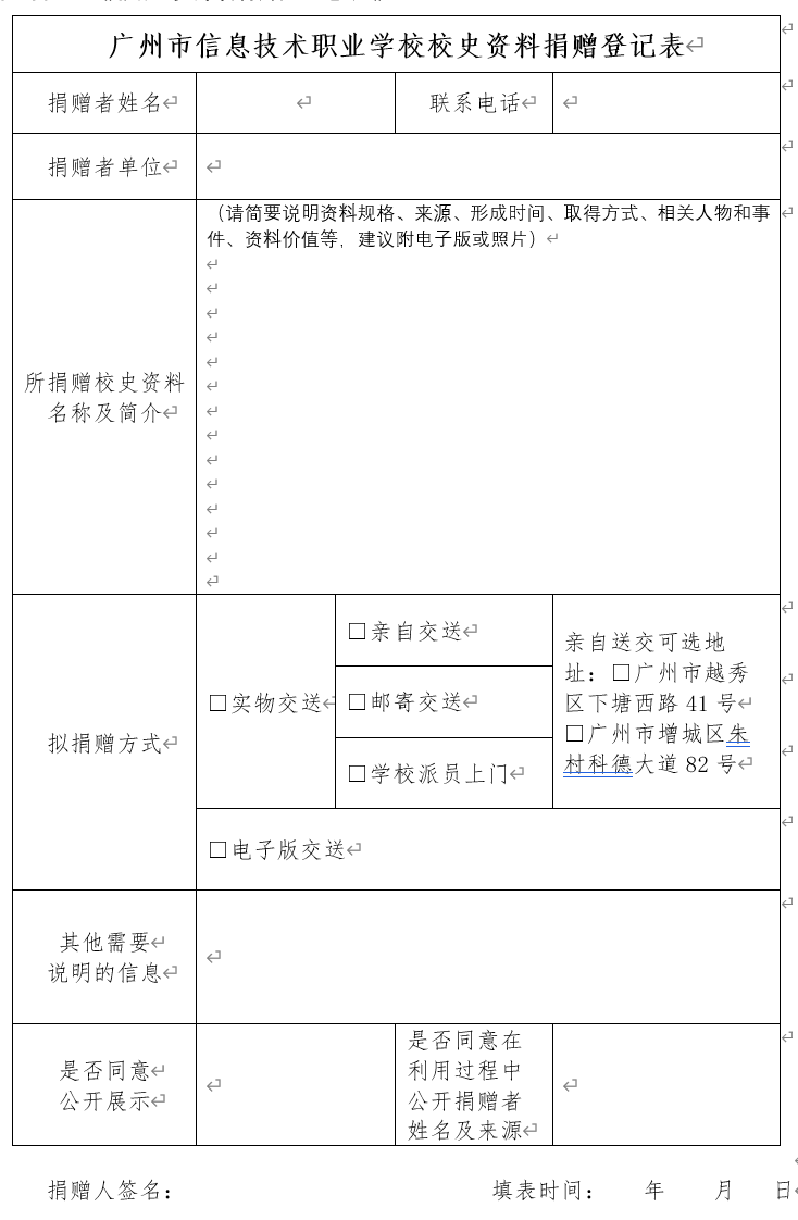 广州市外捐赠的实物类校史资料、具有特殊价值的校史资料,因路途遥远、身体等原因,可联系学校具体协商捐赠方式。