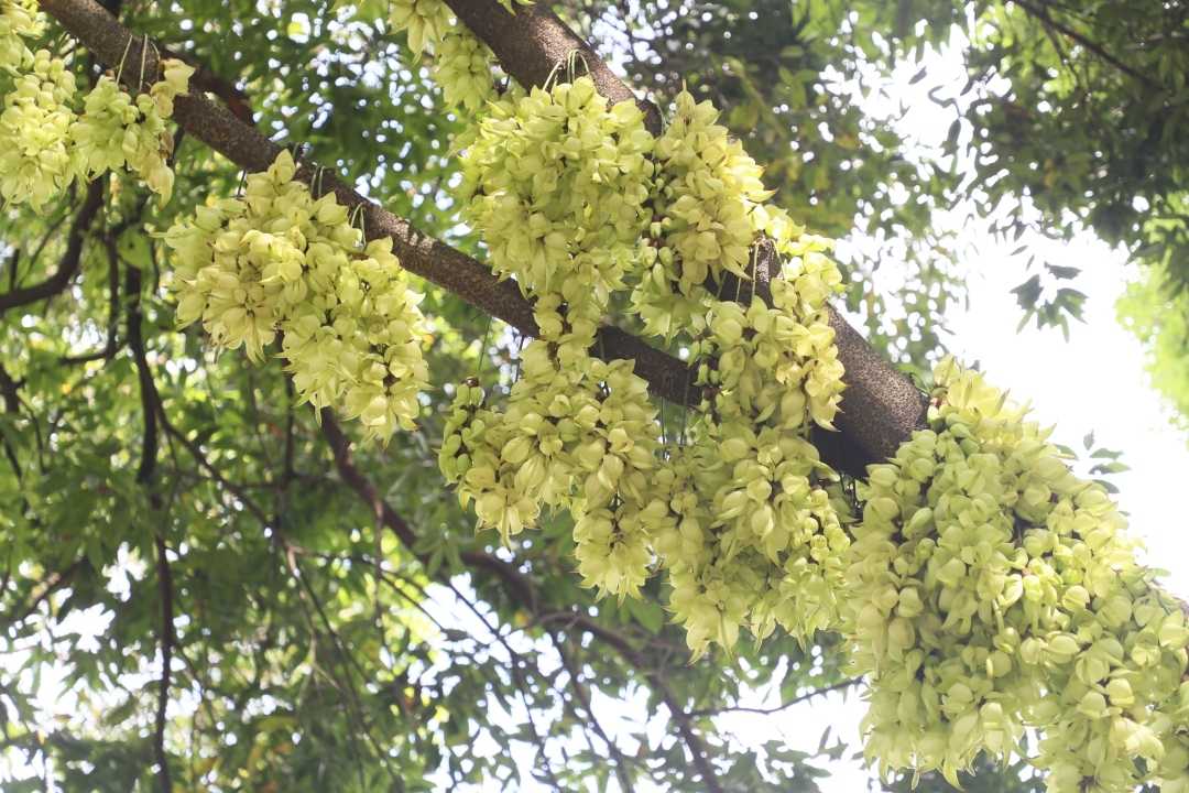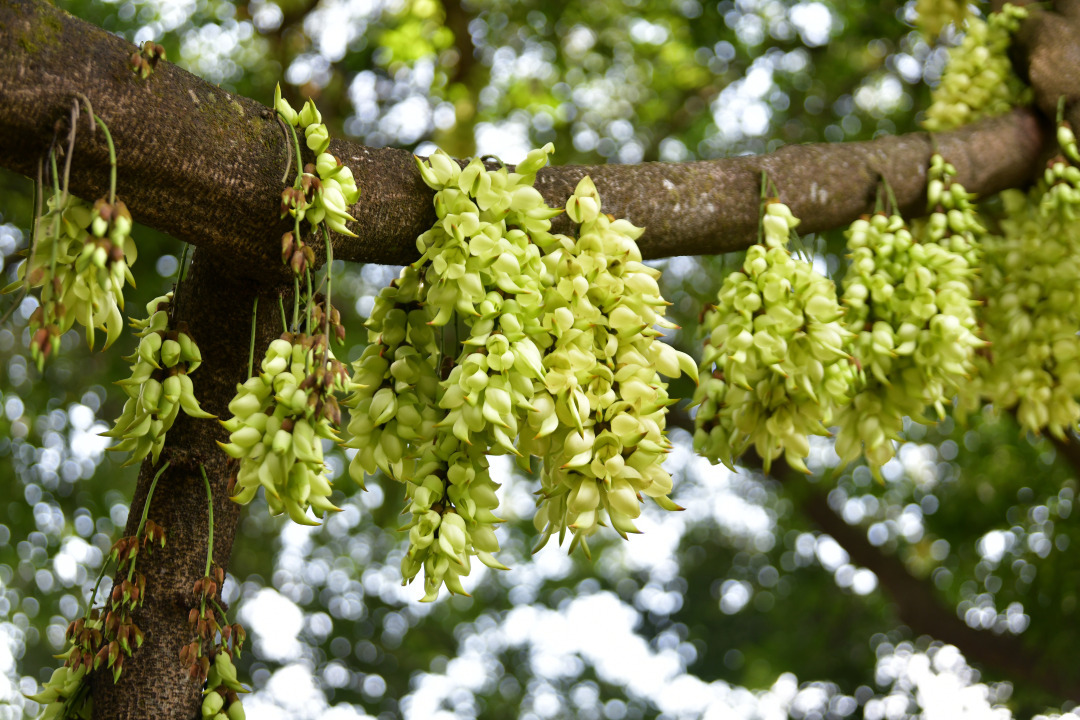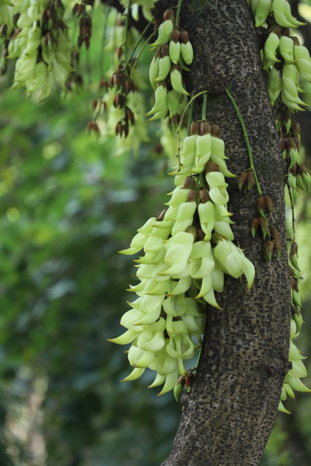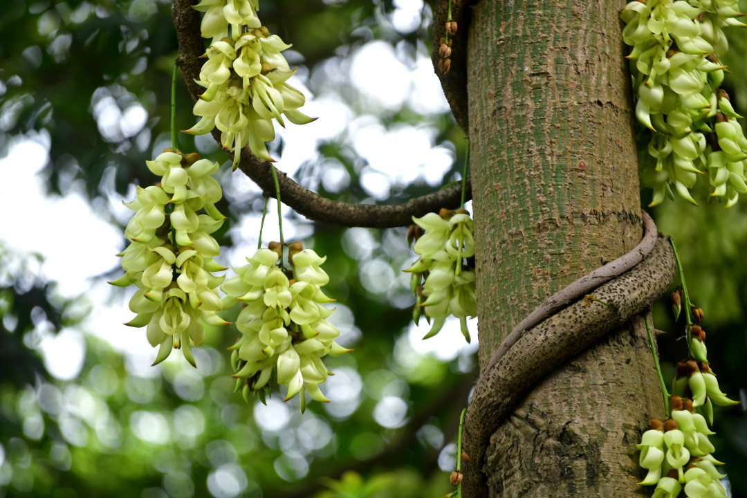 禾雀花,学名白花油麻藤,因其花朵形似禾雀而得名。作为广州市区最大的禾雀花原生群落,天鹿湖森林公园拥有超1000亩野生藤蔓,公园内“千藤闹春”“万鸟栖枝”等独特景观闻名遐迩,每年三月,禾雀花如期绽放,花团锦簇,形成一道独特的自然景观,每年吸引游客约25万人次参观。禾雀花花朵形态奇特,花瓣卷拢好似雀鸟的翅膀,初开时呈现淡绿色或淡紫色,到了盛花期则变成乳白色,盛花期时,一串串禾雀花挂满藤蔓,宛如千万只雀鸟栖息枝头,十分惹人喜爱。