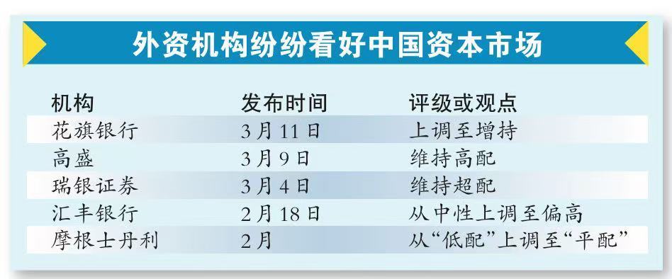 外资机构不仅马不停蹄地调研中国,还在以“真金白银”加码中国。汇丰3月10日发布的投资市场分析报告显示,春节以来,中国A股市场吸引了30亿美元海外资金流入,亚洲股票基金及新兴市场股票基金也将部分仓位从美国调整至中国。