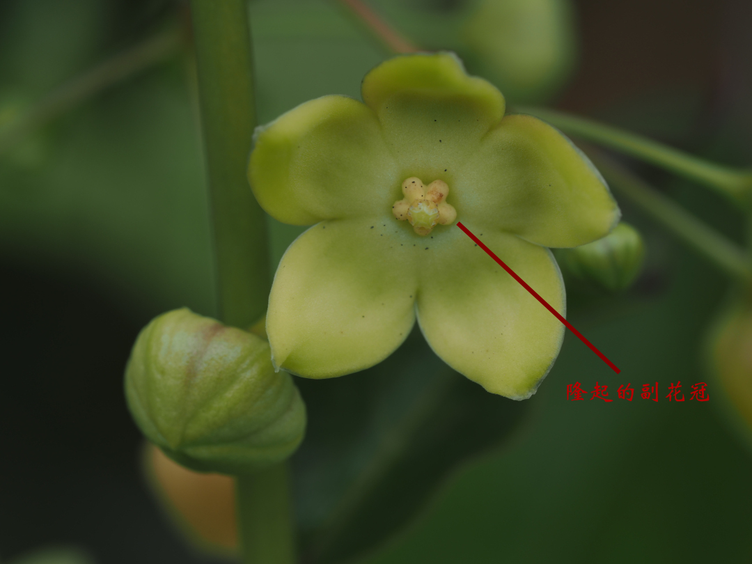 ▲驼峰藤展开的花及隆起副花冠示意图