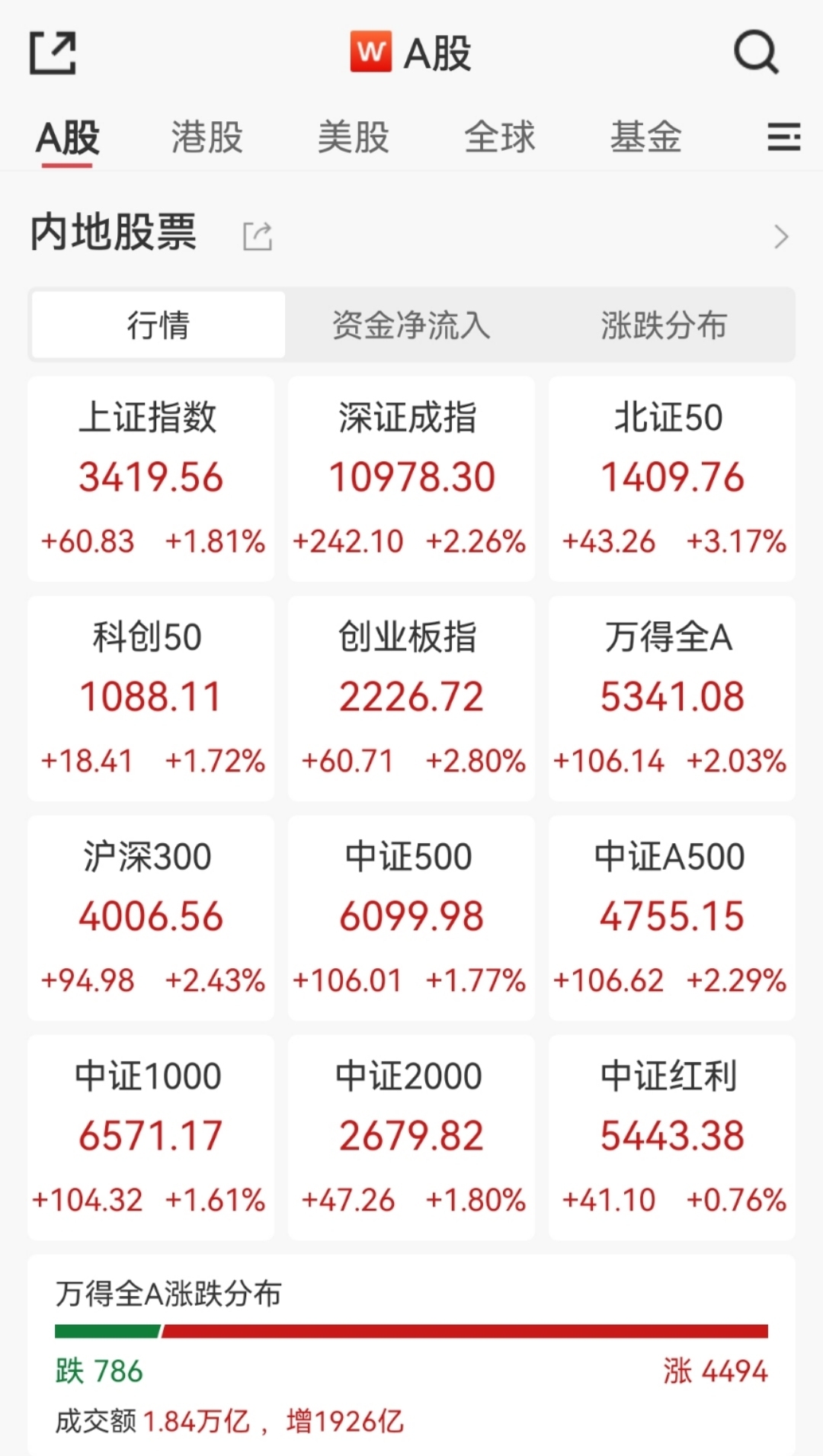 3月14日,A股单边大涨,上证指数收复3400点,创年内新高。A股全天成交1.84万亿元,较前一交易日增加1926亿元。截至收盘,上证指数收涨1.81%报3419.56点,深证成指涨2.26%,创业板指涨2.8%,北证50涨3.17%。