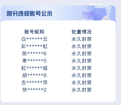 据了解,公告还公布了部分违规账号,其中账号昵称“白xxxxxx云”“彩xxxxxx虹”“虹xxxxx姐”等8个违规账号被永久封禁。