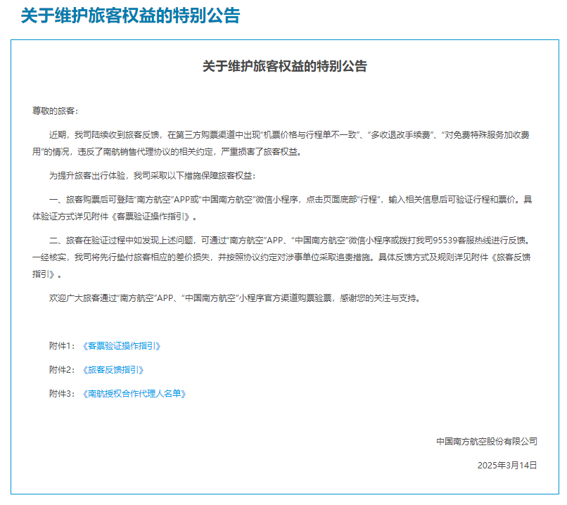 3月14日,南航发出关于维护旅客权益的特别公告表示:近期南航陆续收到旅客反馈,在第三方购票渠道中出现“机票价格与行程单不一致”“多收退改手续费”“对免费特殊服务加收费用”的情况,违反了南航销售代理协议的相关约定,严重损害了旅客权益。