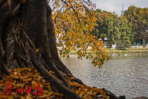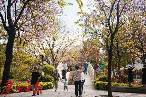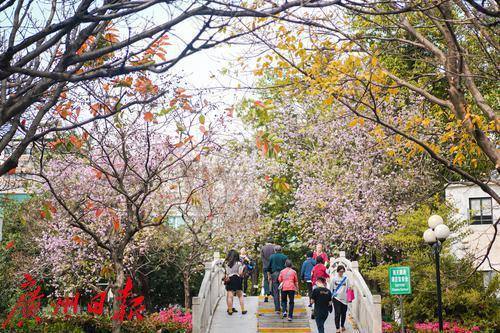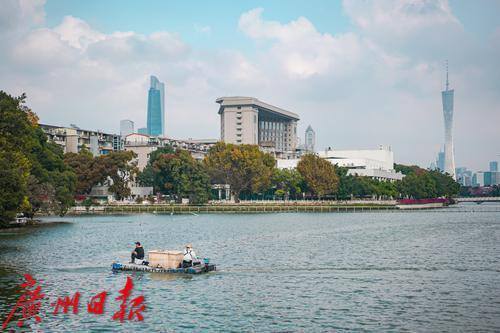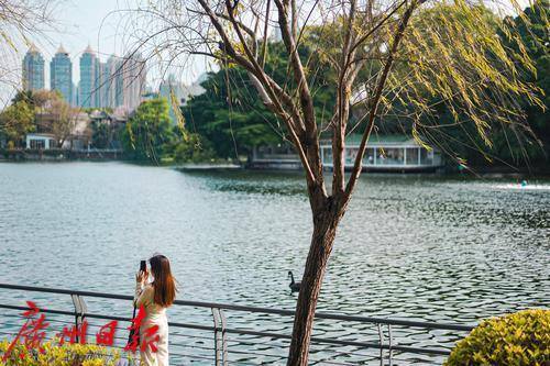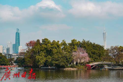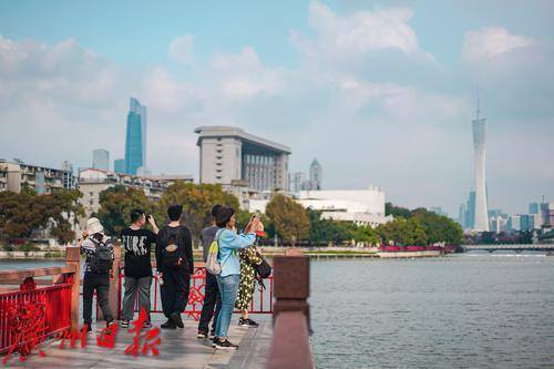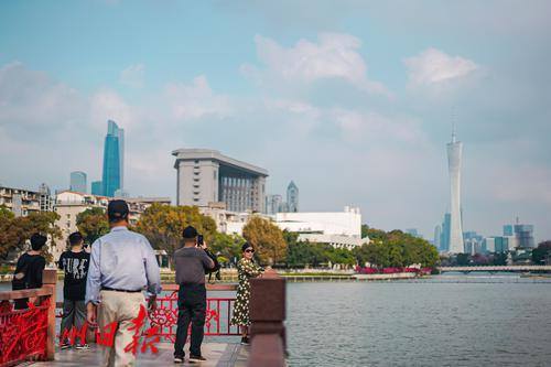 背景处新中轴线上,广州塔等现代建筑林立,市民游客在东山湖上的九曲桥驻足拍照,记录下自然与城市交融的美好景致 。