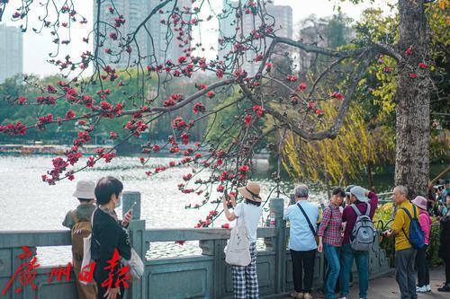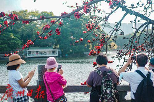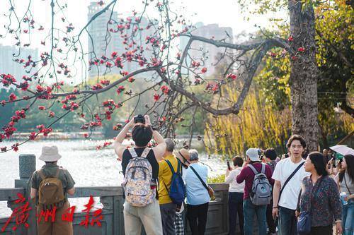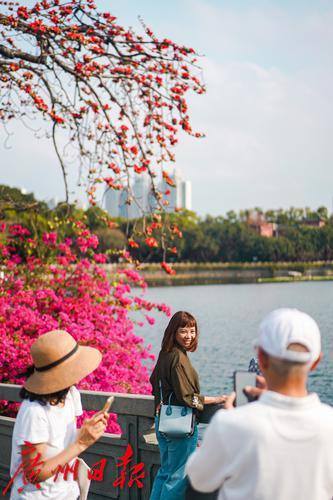 市民游客以湖水旁的木棉花与簕杜鹃为背景拍照。