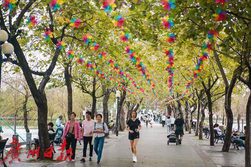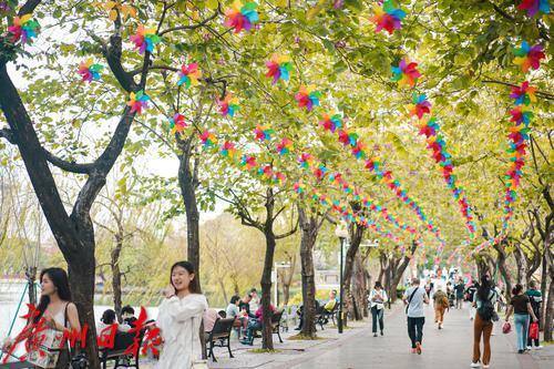 湖畔小道上,人们凭湖闲坐,春风把风车吹得直转。