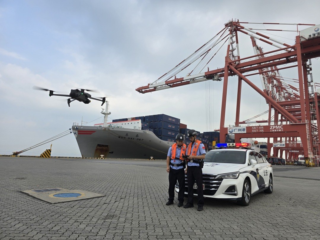 南沙边检站执勤三队民警使用无人机开展码头巡查