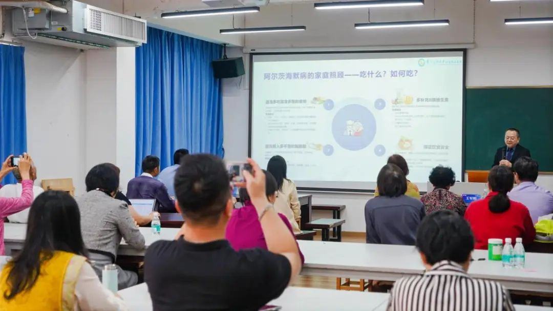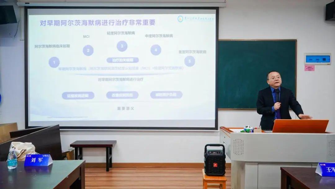活动伊始,广州医科大学神经科学研究所所长、广州医科大学附属第二医院神经科主任刘军教授以《阿尔茨海默病的防与治》为题,带领大家从一段手指操了解阿尔茨海默病。他从该病的产生、早期症状、如何合理照护患者等方面出发,为学员们详细讲解了阿尔茨海默病从防到治的具体方法。