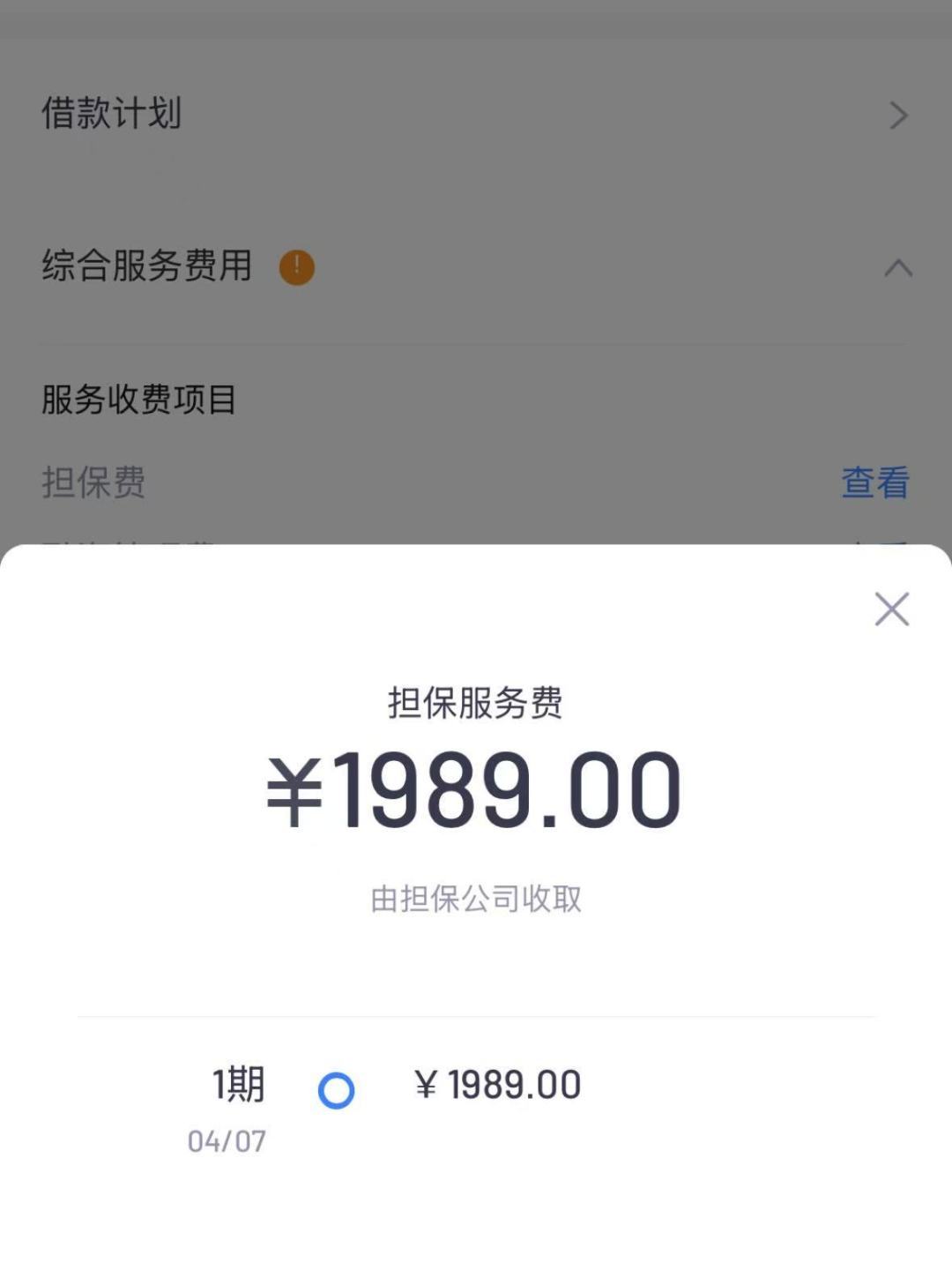 (平台显示还款首期就需支付高达1989元的担保服务费)