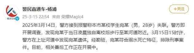 据@警民直通车-杨浦 消息,2025年3月14日,警方接到报警称本市某校学生宛某(男,28岁)失联。警方即开展调查,发现宛某于当日凌晨独自离校后步行至某河道附近。3月15日15时许,警方在上址河道中发现宛某遗体。经勘验,宛某符合溺水死亡特征,排除刑事案件。目前,相关善后工作正在开展中。