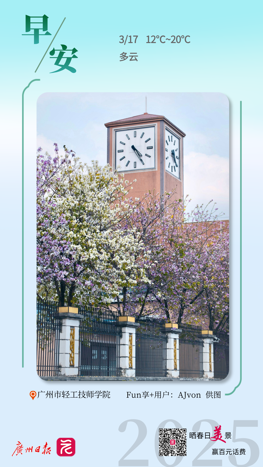 【本周广州天气开启“干爽模式”】未来几天广州白天晴暖,早晚时分略显清凉。广州市气象台预计,3月17日—22日广州以多云到晴为主,昼夜温差加大。详情>>>