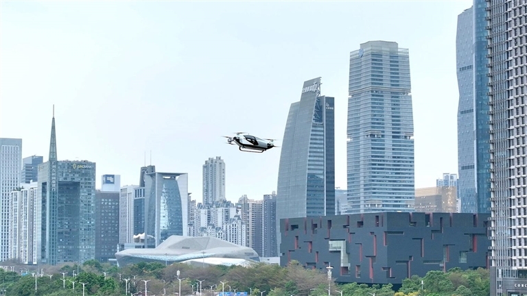 一辆“自动驾驶”的飞行汽车正飞过广州CBD。(资料图片)