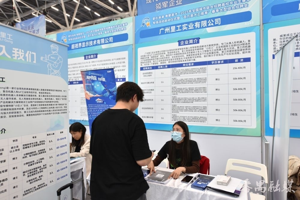 据介绍,番禺区共有268家企业参加招聘会,其中线下24家、线上244家,提供了7100个优质招聘岗位,涉智能网联产业岗位近600个,其中岗位最高年薪达120万,100万以上岗位114个,年薪50万至100万岗位286个。“我们这次有财务类、采购类、研发类、技术类等岗位需求,欢迎各个不同专业、不同院校的同学和复合型人才过来投递,共同在番禺这片热土上施展才华、实现梦想。”海大集团人力资源相关负责人说。