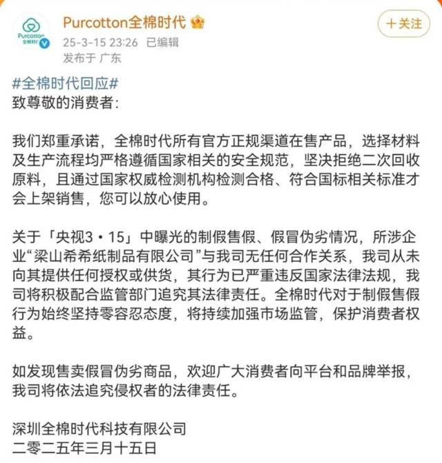 全棉时代也回应:与所涉企业无任何合作关系,从未向其提供任何授权或供货,其行为已严重违反国家法律法规,我司将积极配合监管部门追究其法律责任。全棉时代所有官方正规渠道在售产品,符合国标相关标准才会上架销售。