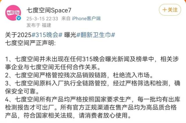 此外,七度空间深夜10时许也发布严正声明:七度空间并未出现在任何315晚会曝光新闻及榜单中,相关涉事企业与七度空间无任何合作关系,所有官方正规渠道在售产品均为高品质合格产品,符合国家相关法规,请消费者放心使用。