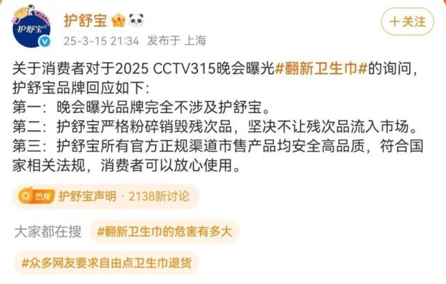 关于消费者对于2025 CCTV315晚会曝光#翻新卫生巾#的询问,护舒宝品牌回应:晚会曝光品牌完全不涉及护舒宝,护舒宝所有官方正规渠道市售产品均安全高品质,符合国家相关法规,消费者可以放心使用。