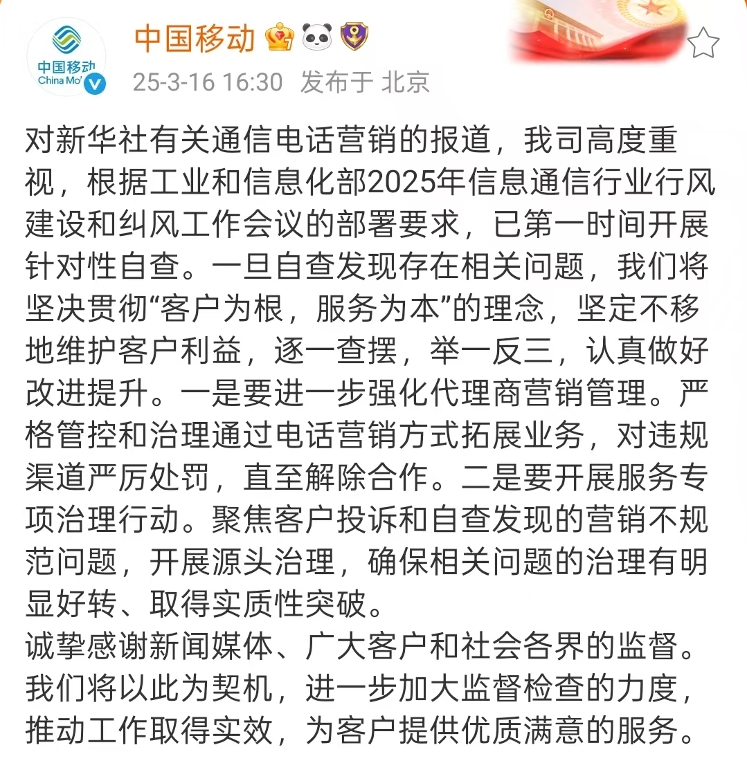 中国移动表示,对新华社有关通信电话营销的报道,高度重视,根据工业和信息化部2025年信息通信行业行风建设和纠风工作会议的部署要求,已第一时间开展针对性自查。一旦自查发现存在相关问题,我们将坚决贯彻“客户为根,服务为本”的理念,坚定不移地维护客户利益,逐一查摆,举一反三,认真做好改进提升。一是要进一步强化代理商营销管理。严格管控和治理通过电话营销方式拓展业务,对违规渠道严厉处罚,直至解除合作。二是要开展服务专项治理行动。聚焦客户投诉和自查发现的营销不规范问题,开展源头治理,确保相关问题的治理有明显好转、取得实质性突破。