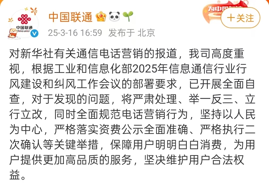 中国联通表示,对新华社有关通信电话营销的报道,高度重视,已开展全面自查,对于发现的问题,将严肃处理、举一反三、立行立改,同时全面规范电话营销行为,坚持以人民为中心,严格落实资费公示全面准确、严格执行二次确认等关键举措,保障用户明明白白消费,为用户提供更加高品质的服务,坚决维护用户合法权益。