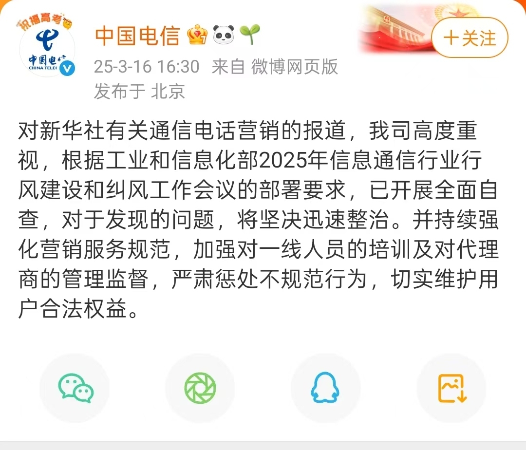 中国电信表示,对新华社有关通信电话营销的报道,高度重视,已开展全面自查,对于发现的问题,将坚决迅速整治。并持续强化营销服务规范,加强对一线人员的培训及对代理商的管理监督,严肃惩处不规范行为,切实维护用户合法权益。