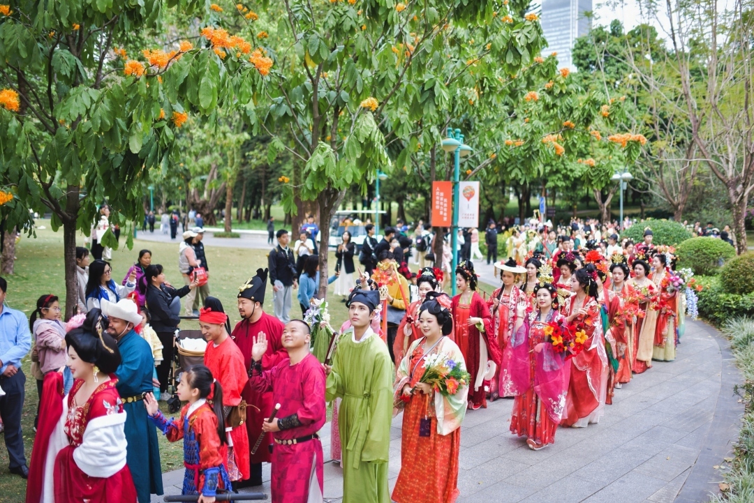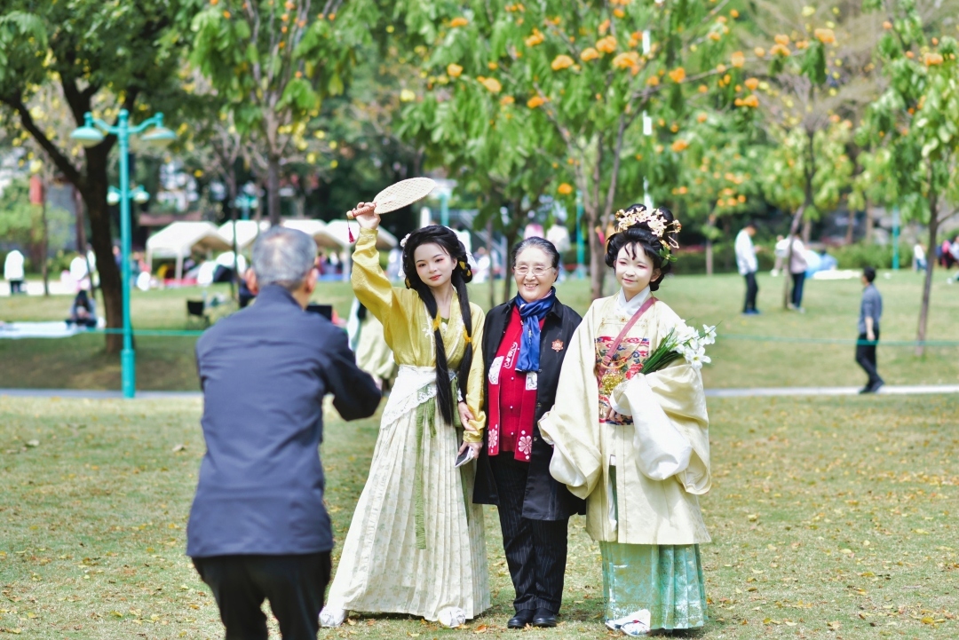 现场,身穿各式汉服的俊男美女在明媚的阳光下风度翩翩,唯美的复古衣裳和簪花头饰让人赏心悦目,在优美的园林环境下再添一道道光彩照人的风景线。不少汉服爱好者和市民群众纷纷与“十二花神”、巡游者合照,打卡花朝节。