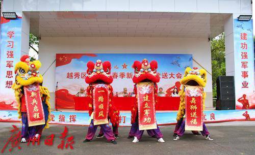 大会现场,杨箕醒狮队的群狮表演和广东医科大学国旗护卫队女子花枪表演“燃”爆全场。这场融合非遗醒狮与国防教育的盛会,吸引了新兵家长、各界群众等300余人参加。