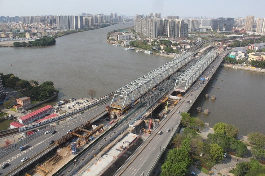作为广湛高铁全线控制性工程,珠江四线特大桥正线长4.9公里,联络线长4.1公里,两次跨越珠江主航道。新建桥梁需在广佛放射线两线公路桥夹缝中穿行,下穿广州内环路高架桥,且紧邻运营中的地铁线路,工程综合难度和安全风险系数在国内同类型工程中属于前列。