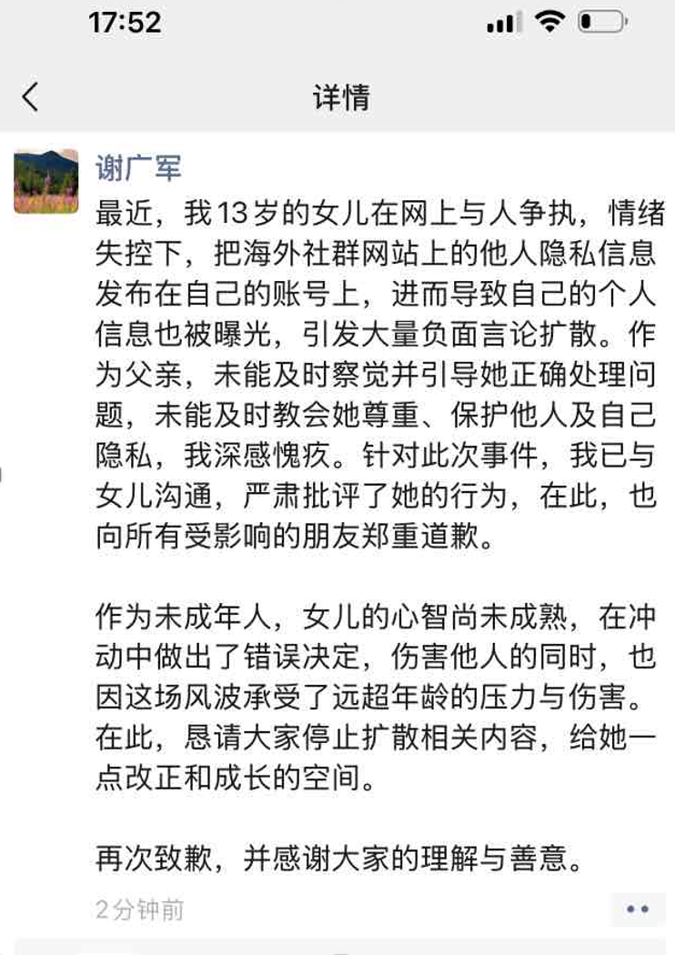 3月17日,百度副总裁谢广军发布微信朋友圈表示深感愧疚,并向所有受影响的朋友郑重道歉。谢广军表示:“我13岁的女儿在网上与人争执,情绪失控,把海外社群网站上的他人隐私信息发布在自己的账号上,进而导致自己的个人信息也被曝光,引发大量负面言论扩散。作为父亲,未能及时察觉并引导她正确处理问题,未能及时教会她尊重、保护他人及自己隐私,深感愧疚,向所有受影响的朋友郑重道歉。”