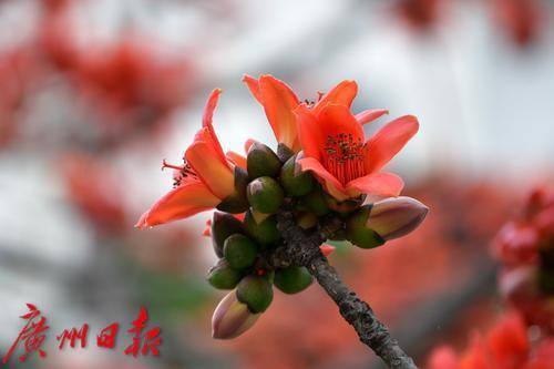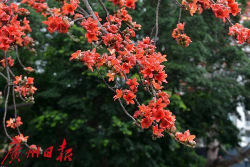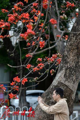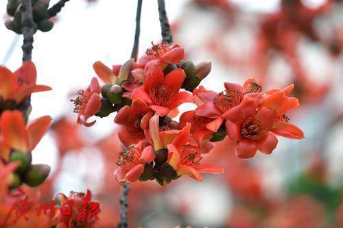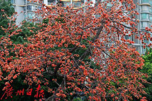 天河区宦溪村村口,几棵木棉树次第开花,硕大的花朵挂在树上,满树红艳,街坊推窗即可赏看红棉。